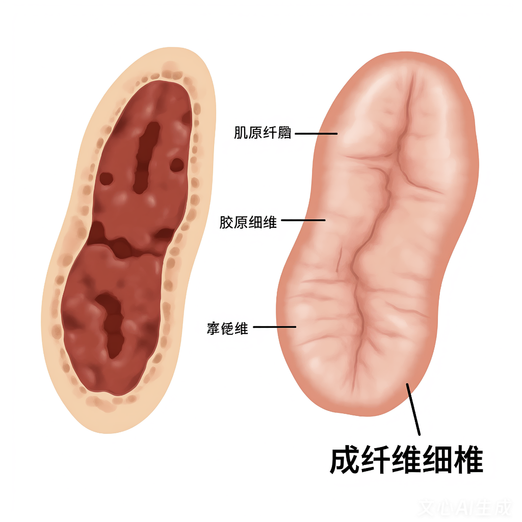 图中左侧展示了增生性疤痕的病理特征:隆起的暗红色硬块,成纤维细胞过度增殖,胶原纤维堆积。右侧则展示了挛缩性疤痕的病理特征:皮肤紧绷凹凸不平,肌成纤维细胞收缩,胶原纤维排列紊乱。通过对比,可以清晰地看出两种疤痕在形态和病理机制上的区别。